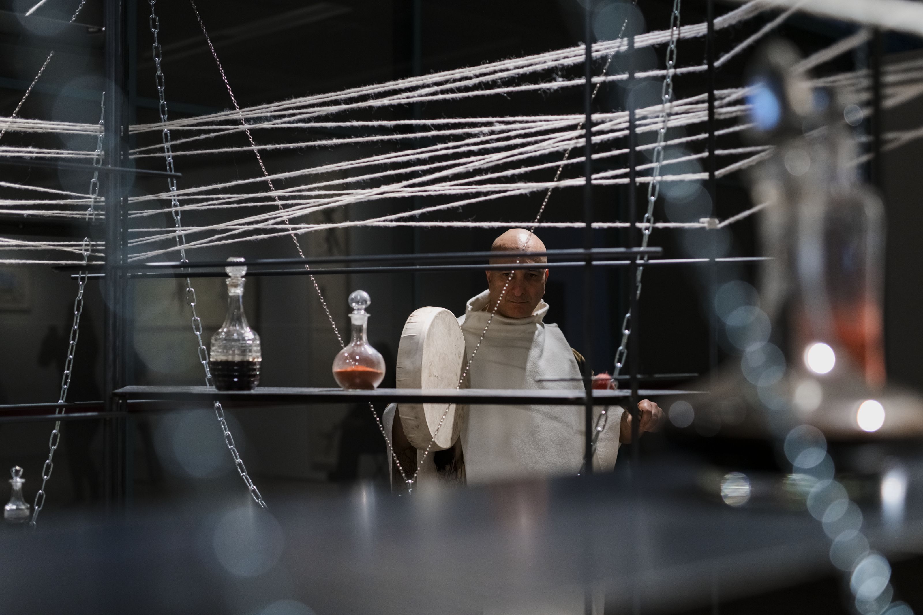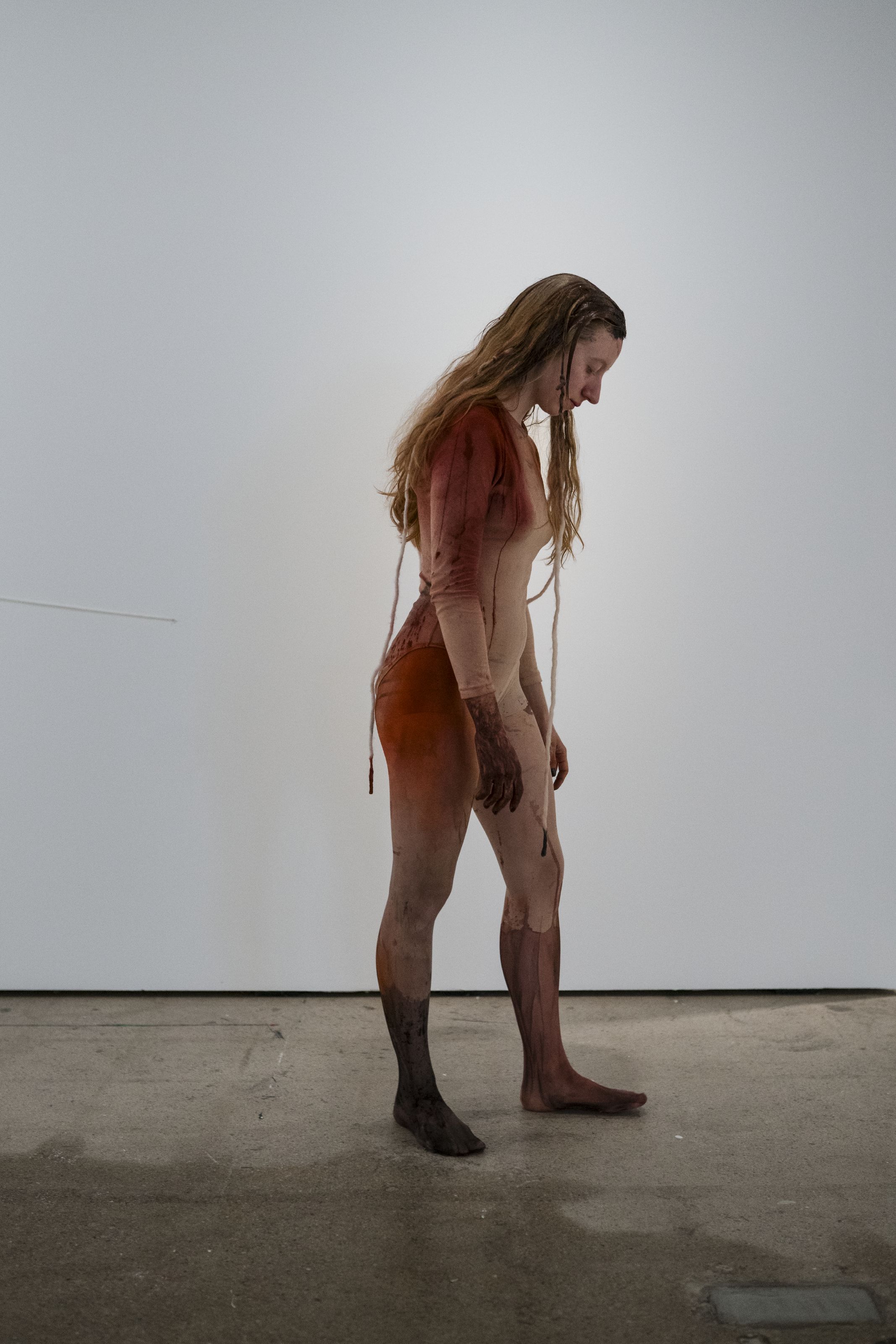 Drawing on the same materials that constitute Conscious Matter, the performer enters the exhibition space physically bound to the Installation; textiles, structural elements, and strands of white wool connected to the performer’s hair. These bindings echo the installation’s exploration of iron in multiple forms (iron ore, iron powder, bodily iron (blood)), foregrounding the elemental continuity between human bodies and the material world.
