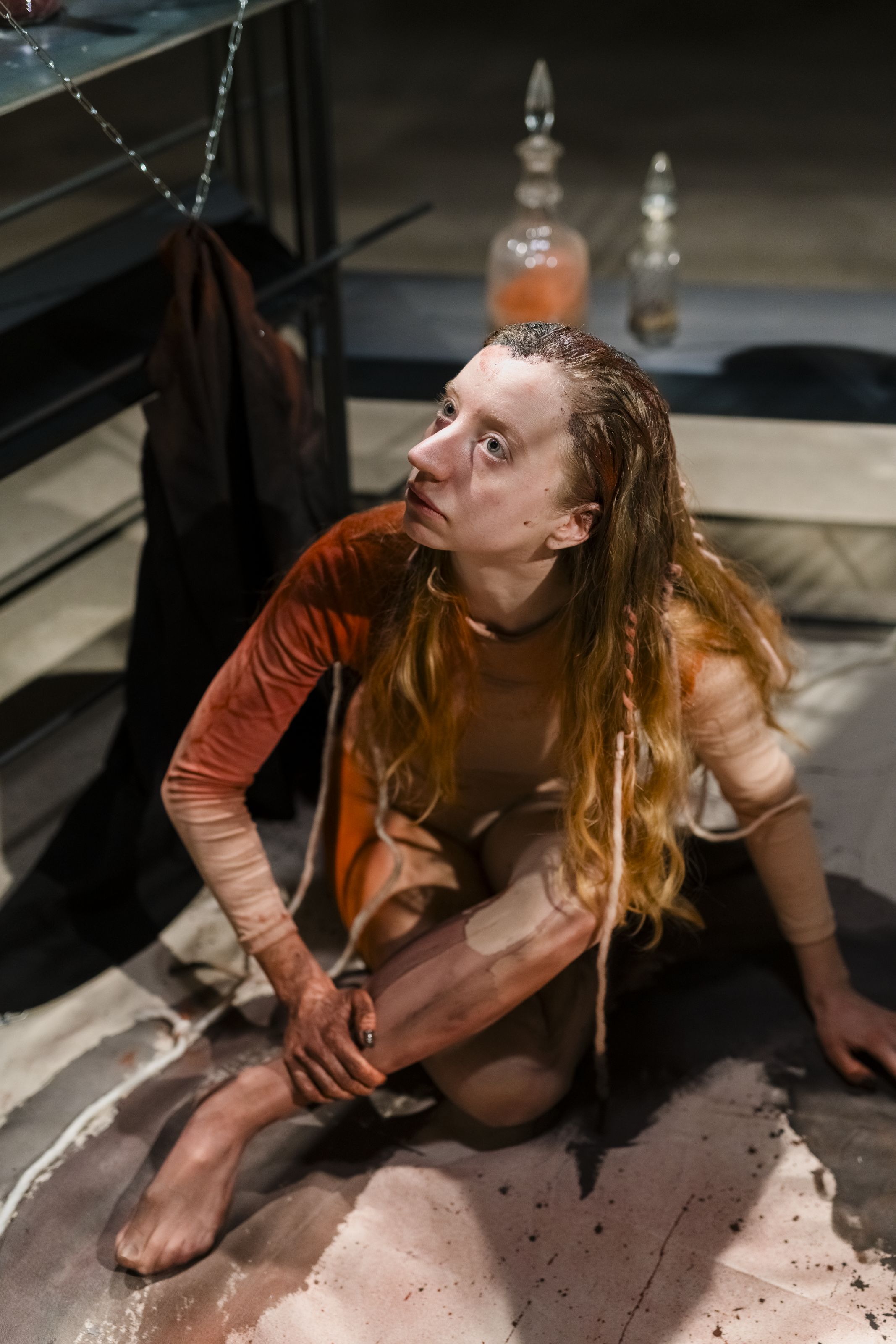 Materials: Iron-based elements from Conscious Matter: iron powder, iron ore fragments, iron-pigmented textiles. Woolen hair-bound cords connecting the performer’s body to the installation. Metal chains constraining the body’s movement. A destructed coat composed of the same layered textile material used in the installation; functions as both costume and sculptural relic. Removed mid-performance and left as an autonomous object. A floor underlay: Large hexagonic, iron-pigmented cloth, acting as both stage and sculptural surface, remaining as a spatial documentation for the performance.
