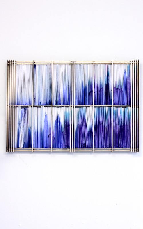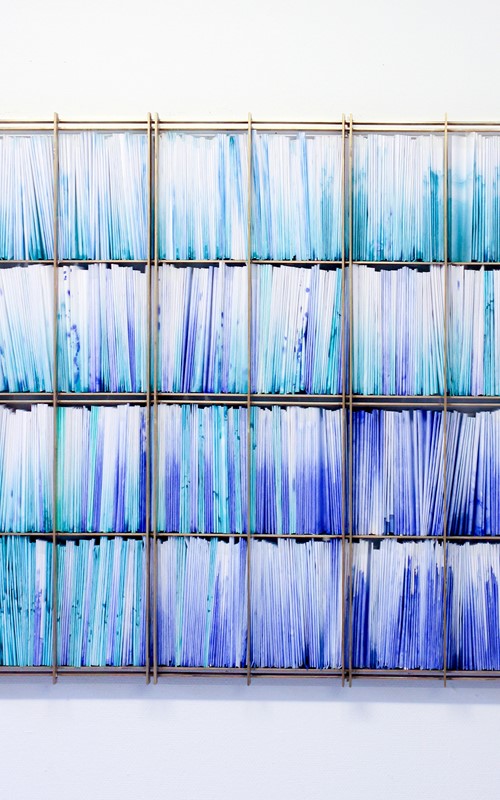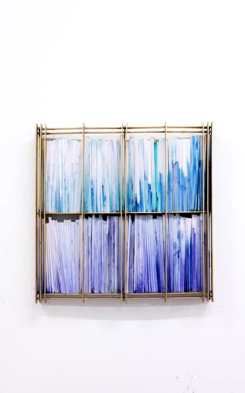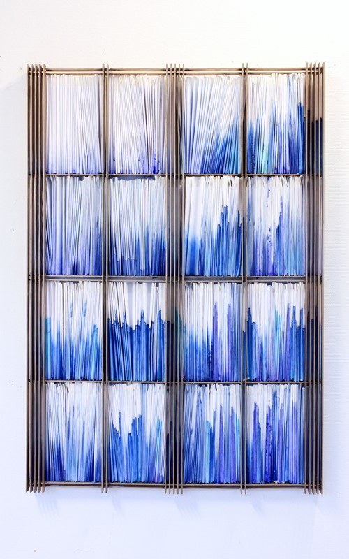 Each work created in the Collected Memory series is unique. Each paper is hand-coloured, meticulously folded and inserted into the metal structure. Thus, no two works are alike. The featured works are coloured with blue pigment.