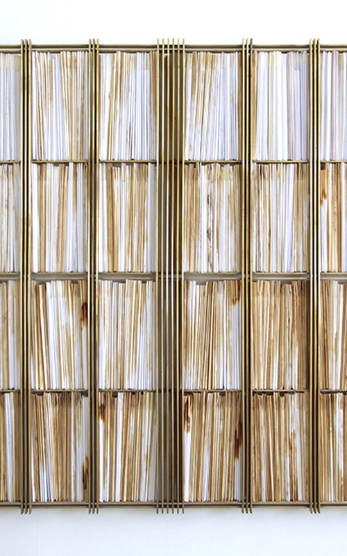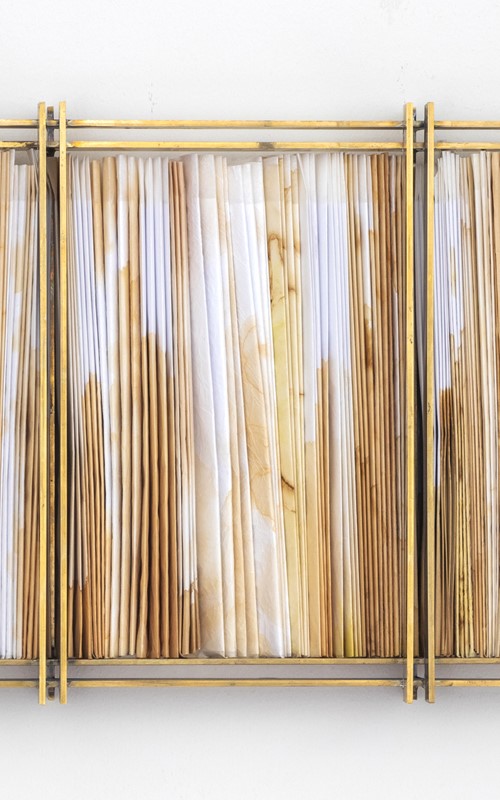 Each work created in the Collected Memory series is unique. Each paper is hand-coloured, meticulously folded and inserted into the metal structure. Thus, no two works are alike. The featured works are coloured with tea.