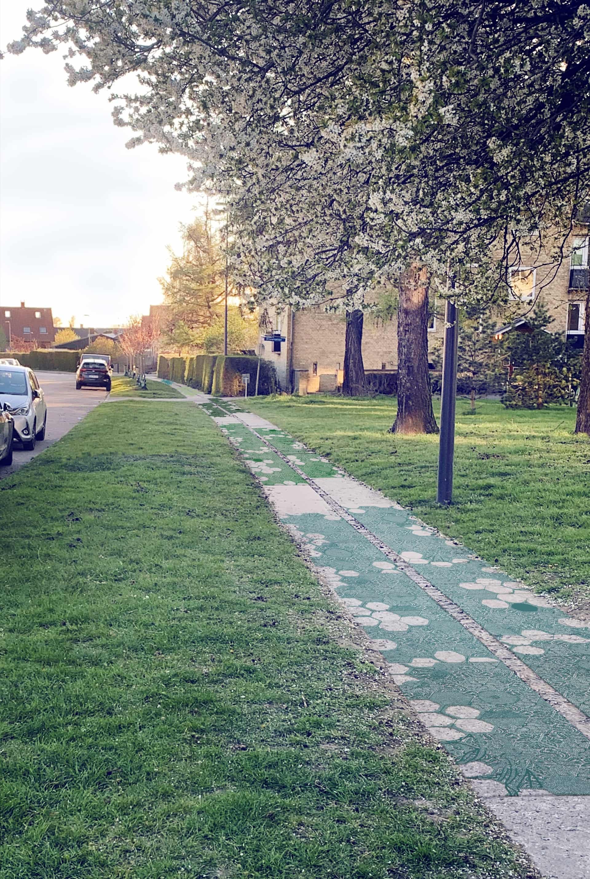 Mille Kalsmose has created a new building-integrated and socially sustainable art piece called Kirsebærbæltet. This work is developed in close dialogue with the local community, It consists of 50 green Copenhagen tiles with a pattern of hexagonal flower silhouettes spreading across the pavement in the Folehave district, Valby.