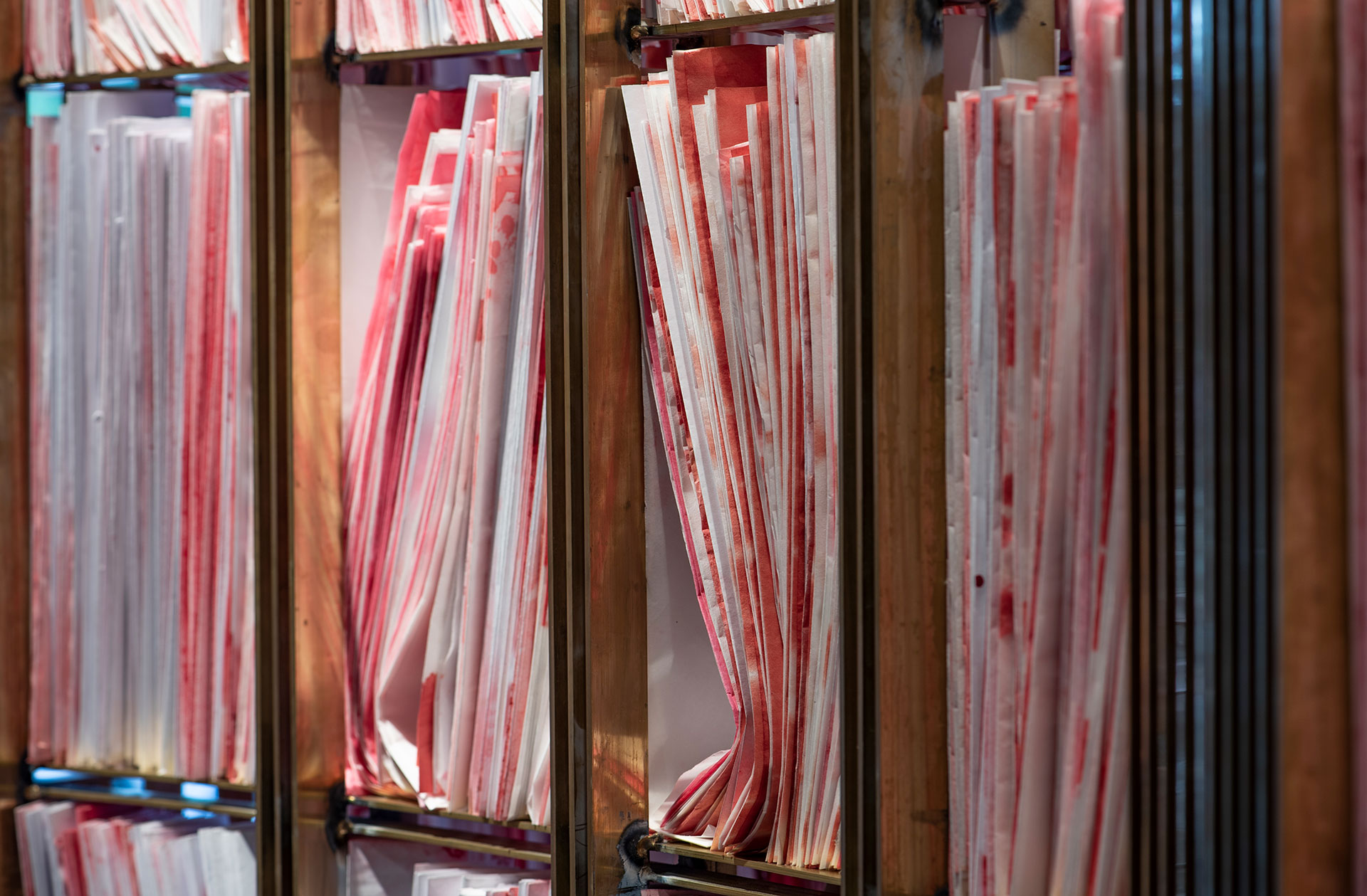The latest iteration of Collected Memory consists of two large brass cabinets housing folded Chinese paper hand-colored with red pigment, giving the impression of drops of blood. These subtly pleated scrolls serve as memorial archives of anonymous individuals. Both a sculpture and an open library, it becomes the miniaturization of an architectural project as an image of our living spaces, between promiscuity and intimacy. For Mille Kalsmose, it is a question of examining the nature of what constitutes identity, in contrast to the usual stereotypes about nationality, blood relations, or gender. These thousands of pages relate stories, experiences, and statements written by participants who share their words through a QR code and an online database.