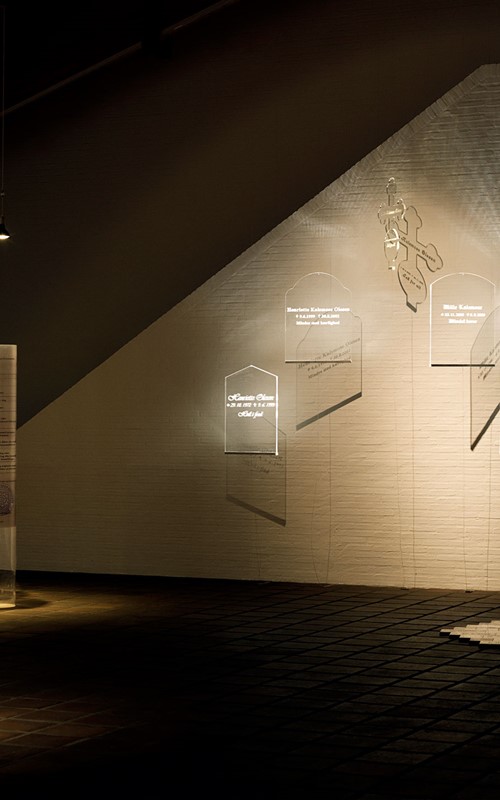 All my Suicides consists of three parts. Part I has five, two meter high cylinder shaped lit columns in plexiglass, which contains different name- and birth certificates all belonging the artist herself. There is one column for each of the five name changes, which Mille Kalsmose-Hjelmborg has taken during the laste 10 years. From her first name Henriette Olesen, which she was born under in 1972, until her existing name, which she took in 2008.