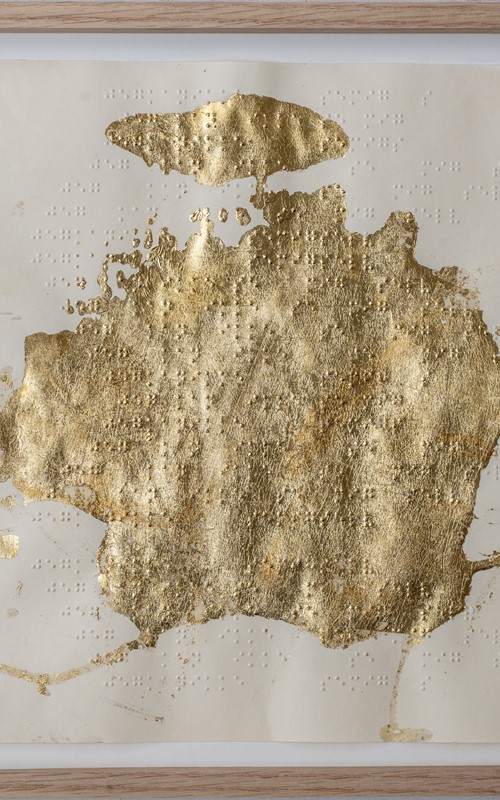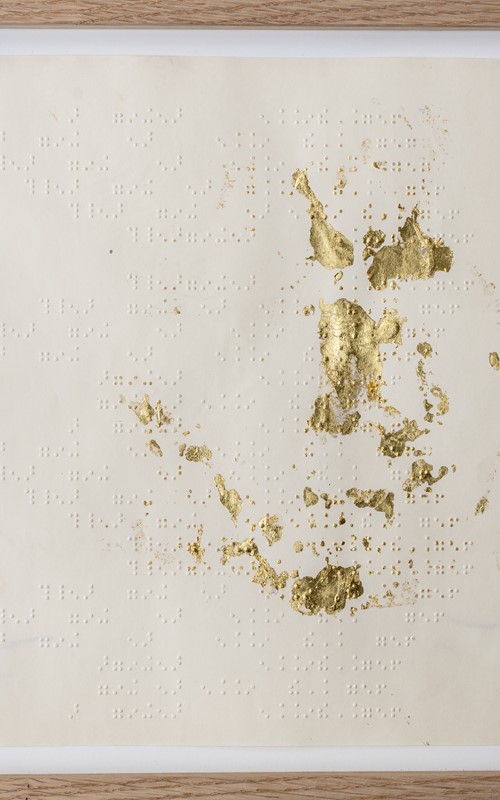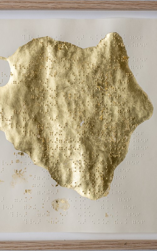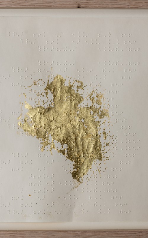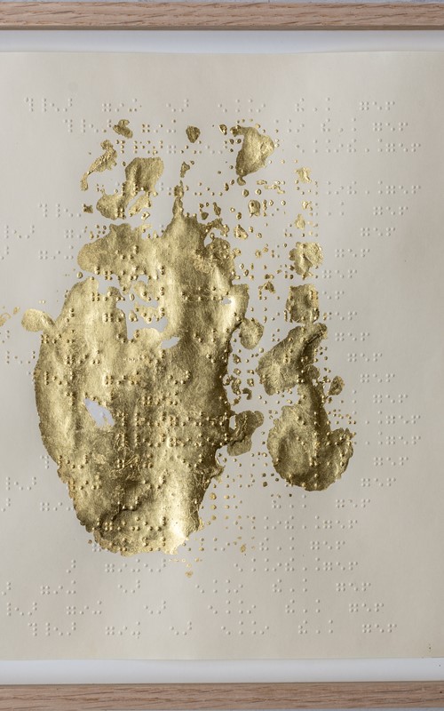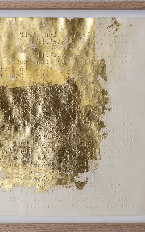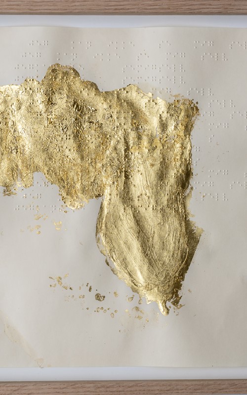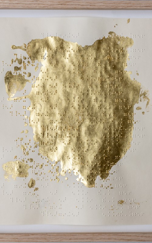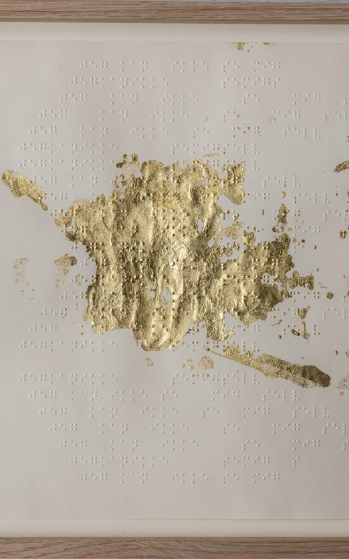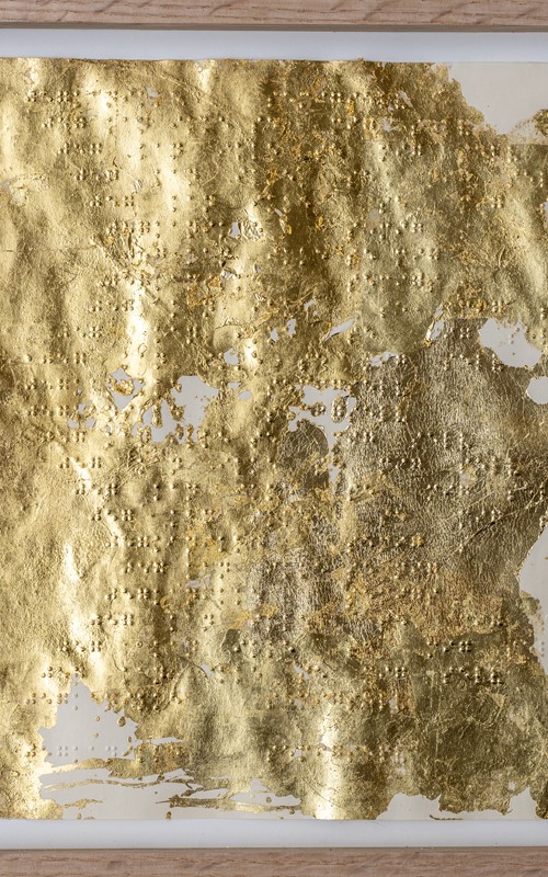 Golden Blindness is a series incorporating braille and gold leaf on paper, a tactile meditation on perception and the unseen.
