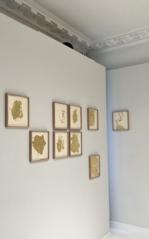 Gold leaf shaped in organic formations, perhaps with associations to a Rorschach test, may reflect our perspective on the world and open a pathway to our inner landscape. The braille reads "I cannot see myself" and was developed in collaboration with the Blindness Institute.
