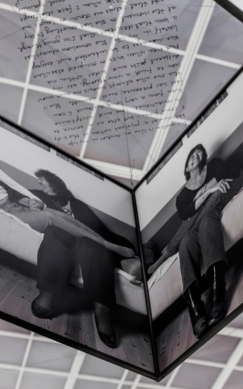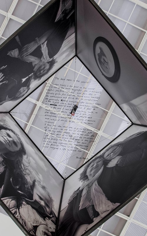 The physical installation consists of six 90 x 90 x 90 cm cubes, constructed of double-sided Dibond disks and suspended within iron frames. These sculptural forms invite the viewer to literally insert themselves into the work by placing their heads inside the cubes. Within, viewers encounter portraits, mirrored surfaces, and intimate handwritten texts from daughters describing their relationships with their mothers. As one moves through the installation, the photo of Mille’s new mother becomes more visible — clearer with each text encountered — suggesting that through understanding the stories of others, one might approach clarity in their own longing.