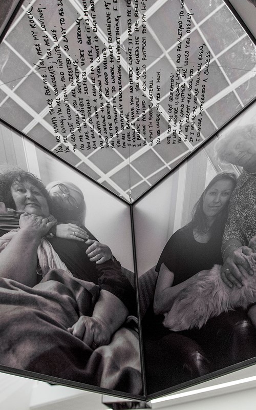 “Searching for a Mother” can be understood in continuation of these two works about identity and the family. But even more than the two earlier works, the artist’s new take on the “family concept” is an autobiographical doing. It is a work about identity and it is identity work at one and the same time. By being constituted as a personal and practical project in the real world it presents an idea of life and art as indistinguishable. Or one could say that it is art-work as identity work, art and identity both in process and progress. “Searching for a Mother” explores the question of a personal reality that is coming into being through the very act of exploring this particular personal reality and by materializing it in the large cubes, the photographs of mothers and daughters and the tactile hand-written texts where daughters are affectionately describing their relationship with their mothers.