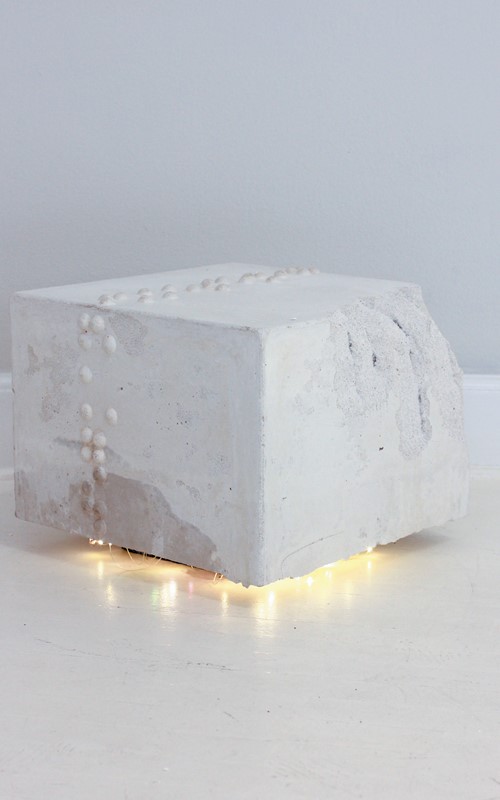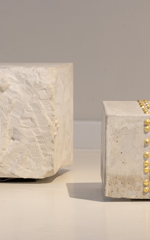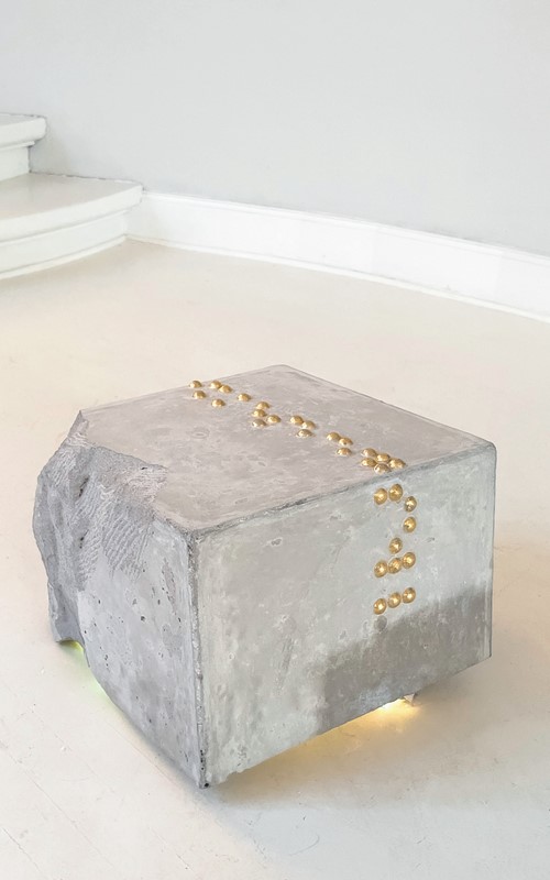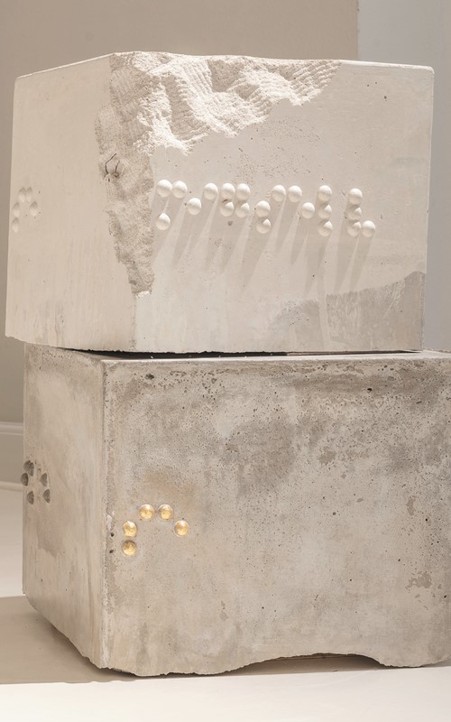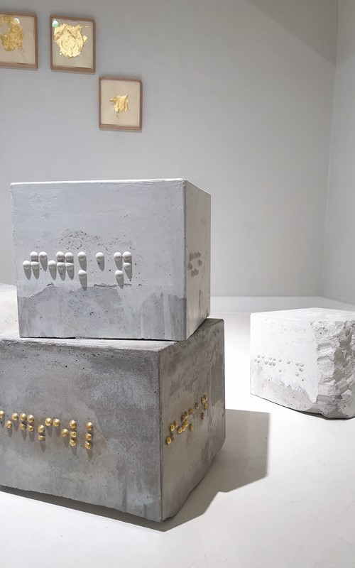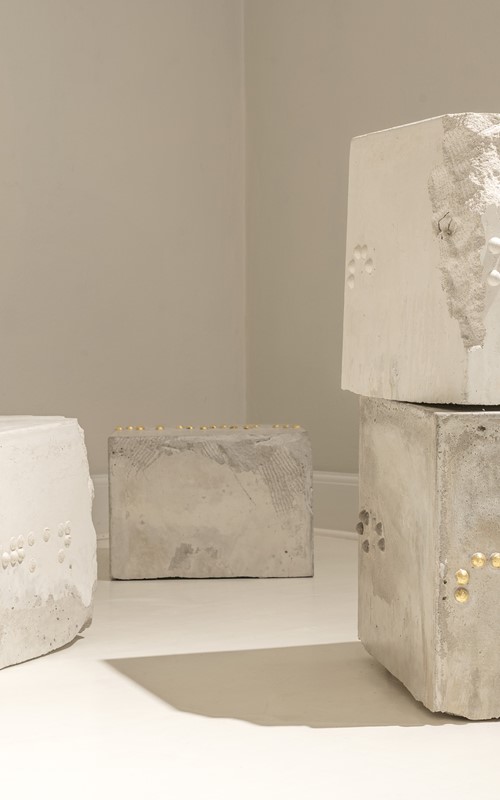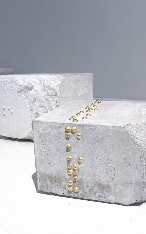 The work incorporates braille and gold leaf on concrete blocks as a tactile meditation on perception and the unseen. The blocks appear familiar, as architectural reminiscences from previous empires, and at the same time as blocks of knowledge, outside time and space.