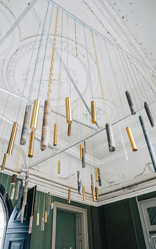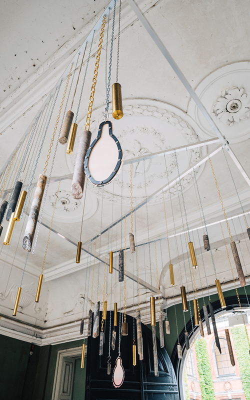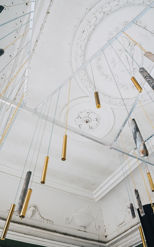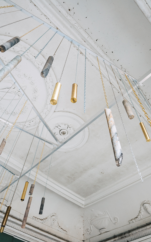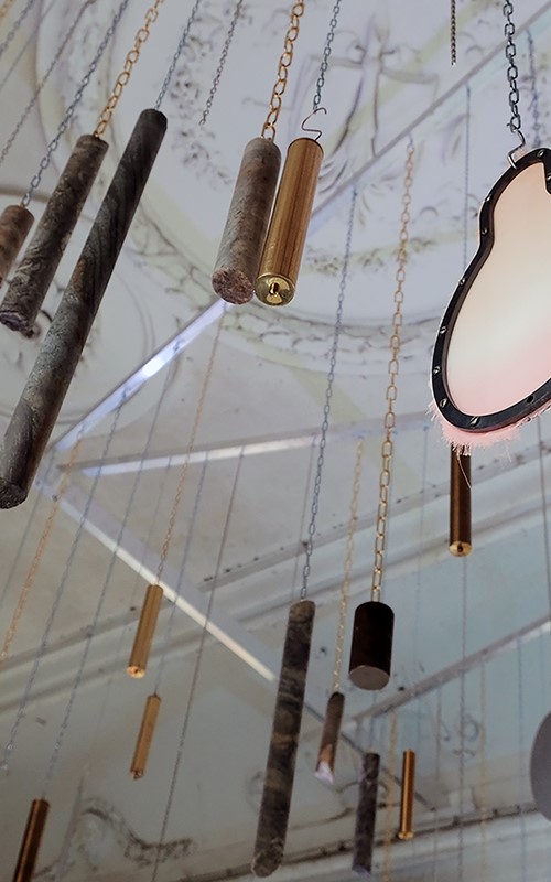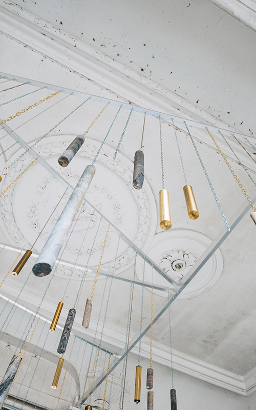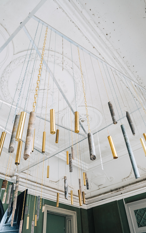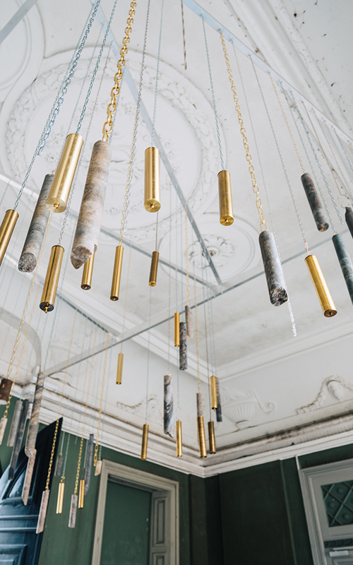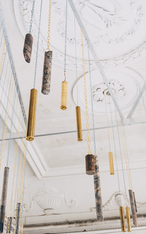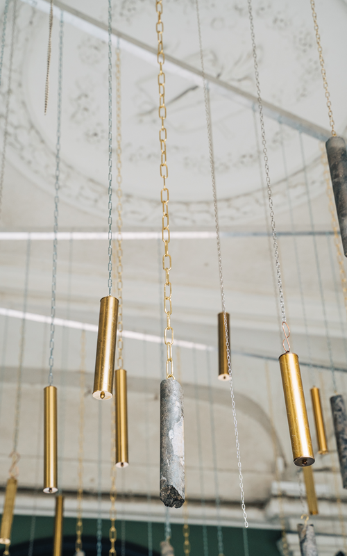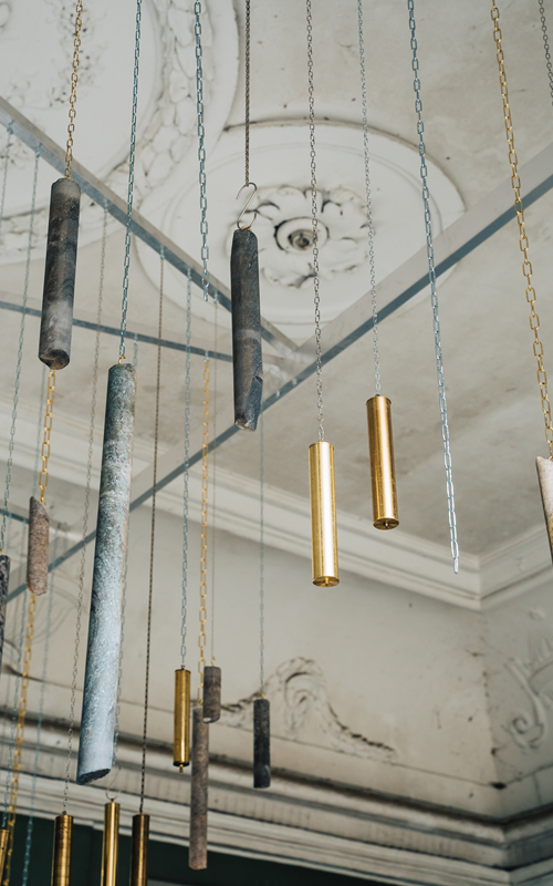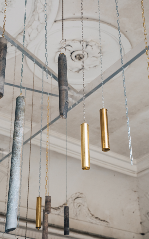 Kalsmose explores connectedness to ourselves, to each other and to cosmos. She combines branches of science such as geology and astronomy with spirituality and subjective perspectives. With Weight of Memories, we are confronted with something that intersects different time divisions – geologically with the iron cores and culturally with the brass pendulums. The work reveals how the past is not gone but embedded — a resonance that remains.