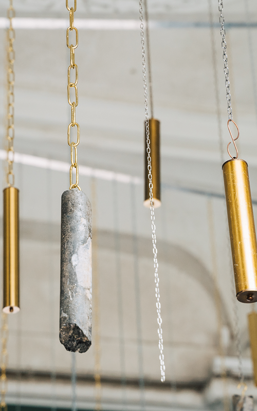 The work consists of brass pendulums, as known from traditional grandfather clocks, and iron cores excavated from some of the planet's oldest rock formations.These rock formations contain billions of compressed years that can be categorized and classified through sedimentation and geological analysis – similar to how astronomers can estimate distances in time and develop theories about the origin of life by studying the same materialities, only in outer space.